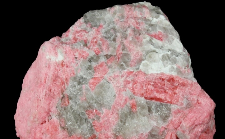 Thulite is a pink variety of the mineral zoisite frequently manganian, i.e. containing trivalent Mn. It is named after the mythical island of Thule. It originated in the early 19th century in Norway’s Telemark region.