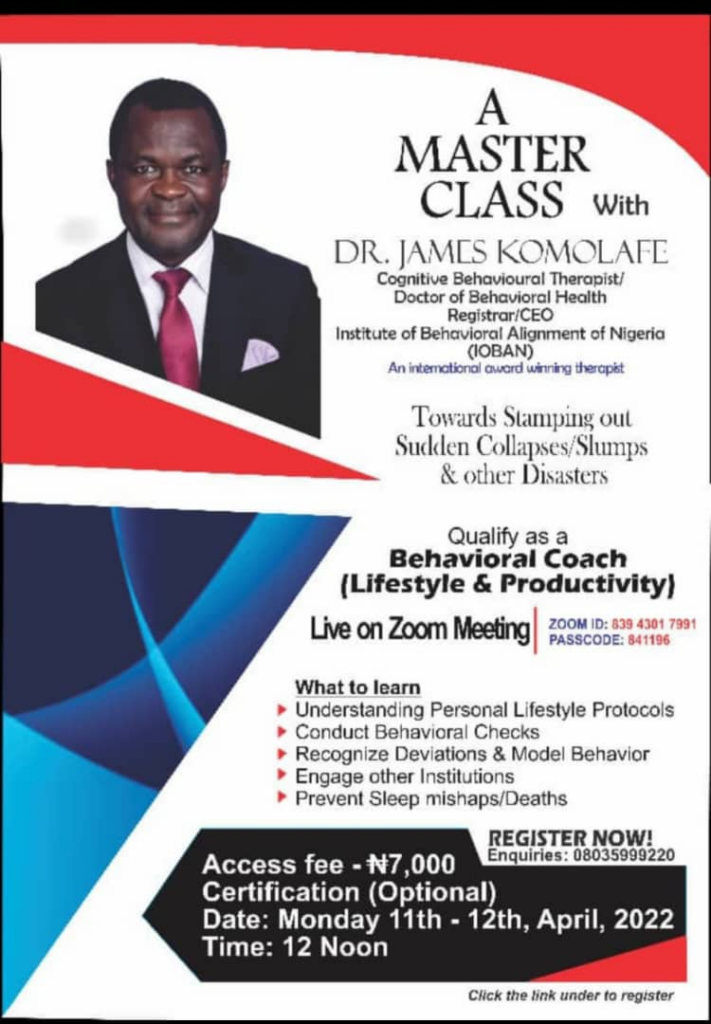 15 common practices that natives do by habits that may not translate into true rest but gradual disaster; hear details on zoom meeting over these vital errors taking lives for free in our world; Monday 11- Tuesday 12, April, 2022 @ 12:00PM; Click here to register now..https://chat.whatsapp.com/Jye5WPu4PLB0XHVf7rqL2Q (WhatsApp number for Dr.James Komolafe 08035999220)